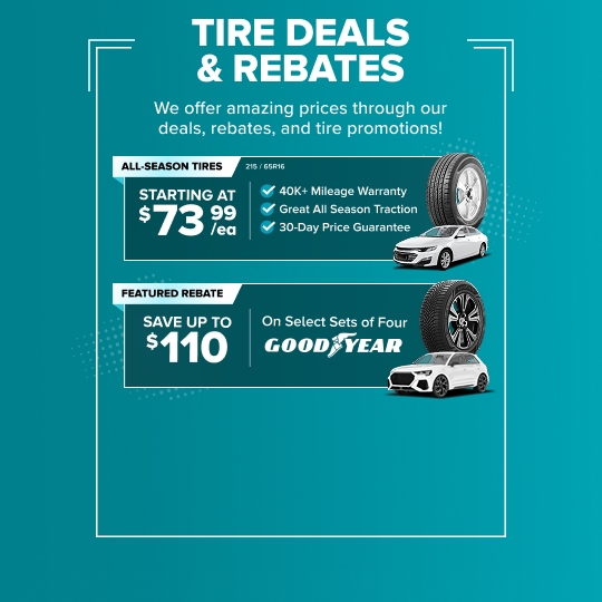 On the rare occasion that you find tires sales at a lower price, just submit the ad, tire size, and brand to our Price Buster Squad. You'll be shown available tire deals at the same price. Take advantage of our exclusive tire sales and get the best deals on high-quality tires for your vehicle. Save more with our unbeatable tire sales today!