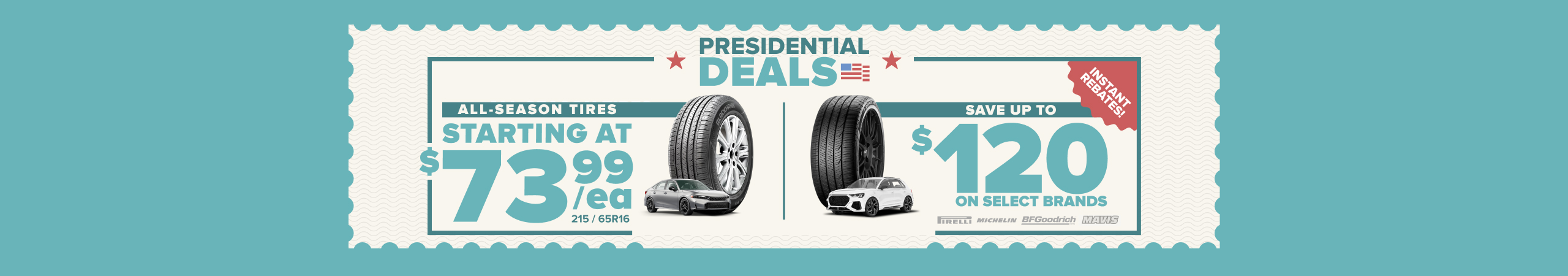 Take advantage of our huge President's Day auto service and tire deals this year, including $140 off brakes, $20 off oil changes, and up to $220 off a set of 4 tires. Book your holiday service online today and save big at a Mavis near you!