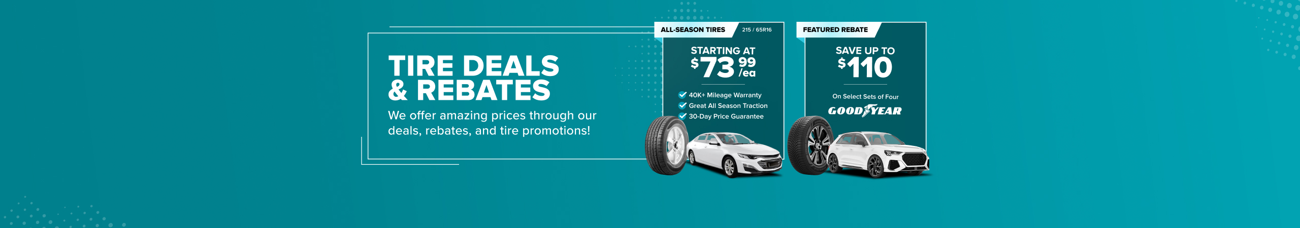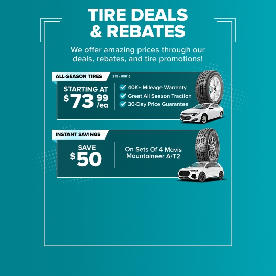 On the rare occasion that you find tires sales at a lower price, just submit the ad, tire size, and brand to our Price Buster Squad. You'll be shown available tire deals at the same price. Take advantage of our exclusive tire sales and get the best deals on high-quality tires for your vehicle. Save more with our unbeatable tire sales today!