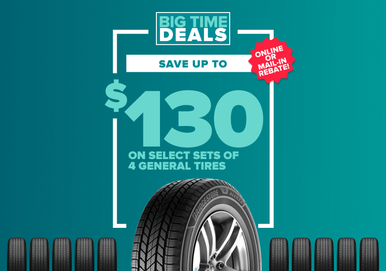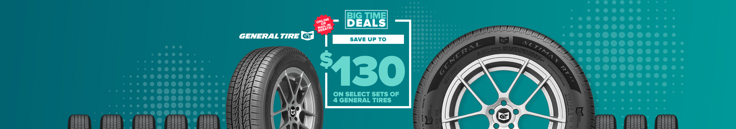 Download and mail-in this rebate form or fill it out online to save up to $80 on your purchase of 4 select General tires. Plus, an extra instant $50 in online-exclusive savings. Offer valid through 4/30/26.
