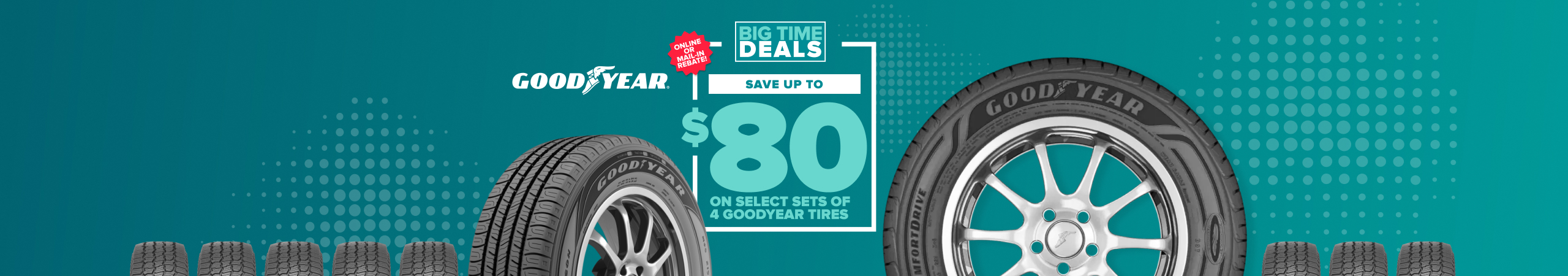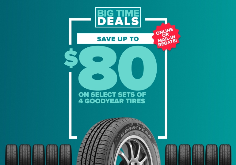 Download and mail-in this rebate form or fill it out online to save up to $80 on your purchase of 4 select Goodyear tires. Offer valid through 6/30/26.