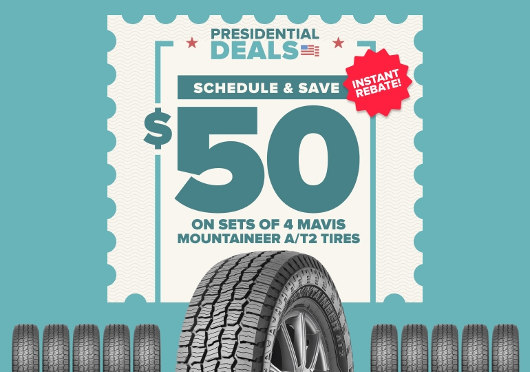 Save $50 INSTANT with purchase of 4 Mavis Mountaineer A/T2 tires. Offer valid on purchases made 1/5/2026 through 2/28/2026.