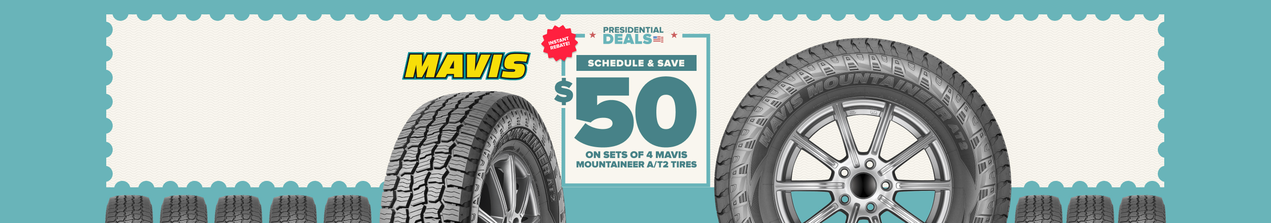 Save $50 INSTANT with purchase of 4 Mavis Mountaineer A/T2 tires. Offer valid on purchases made 1/5/2026 through 2/28/2026.