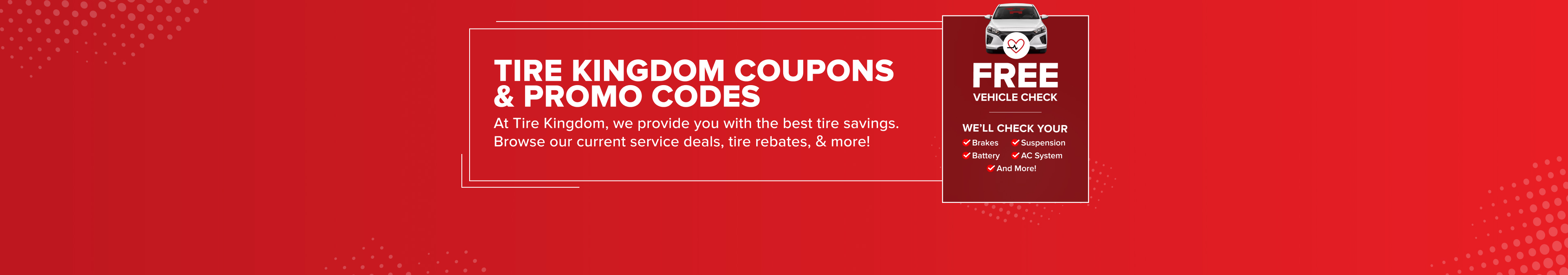 Tire Kingdom offers a variety of exclusive savings to keep your car rolling. View all our deals, rebates, and service specials that will save you extra money on quality auto care.