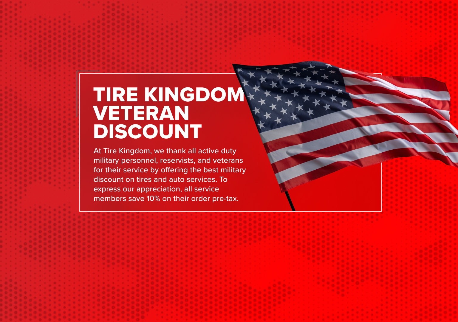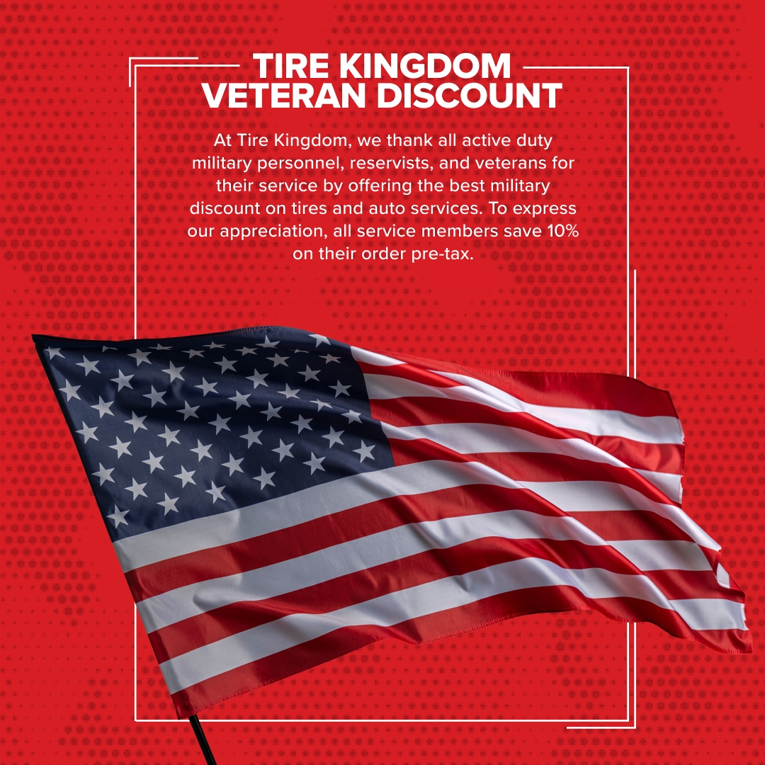 At Tire Kingdom, we serve those who serve us. Our military discount is promised at every Tire Kingdom location nationwide with a valid military ID. Stop by our store to save on tires and auto services.