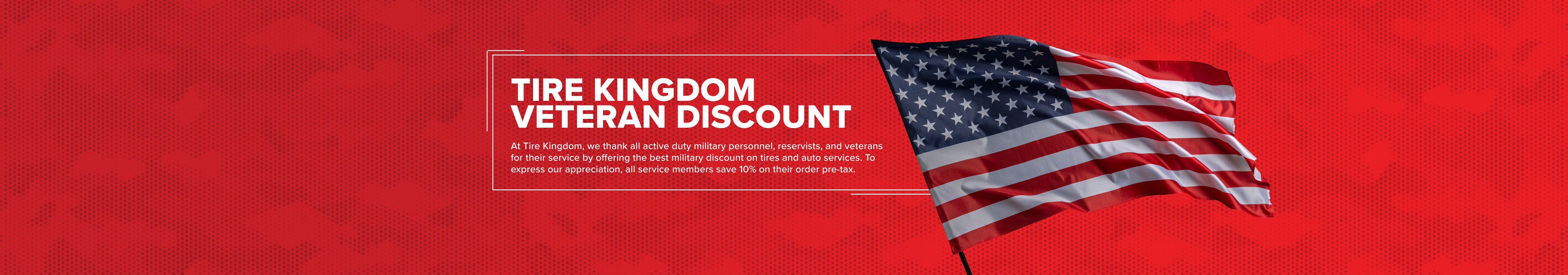 At Tire Kingdom, we serve those who serve us. Our military discount is promised at every Tire Kingdom location nationwide with a valid military ID. Stop by our store to save on tires and auto services.